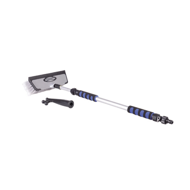 Een van de belangrijkste kenmerken van deze set is de telescopische steel met waterdoorloop. De steel is in lengte verstelbaar, zodat je moeilijk bereikbare plekken eenvoudig kunt schoonmaken. Dankzij het waterdoorloopsysteem kan de steel direct op een waterslang worden aangesloten. Hierdoor stroomt er continu water door de borstel tijdens het schoonmaken, wat zorgt voor een nog grondiger reinigingsproces. Dit systeem bespaart tijd en zorgt ervoor dat je geen emmers water nodig hebt.